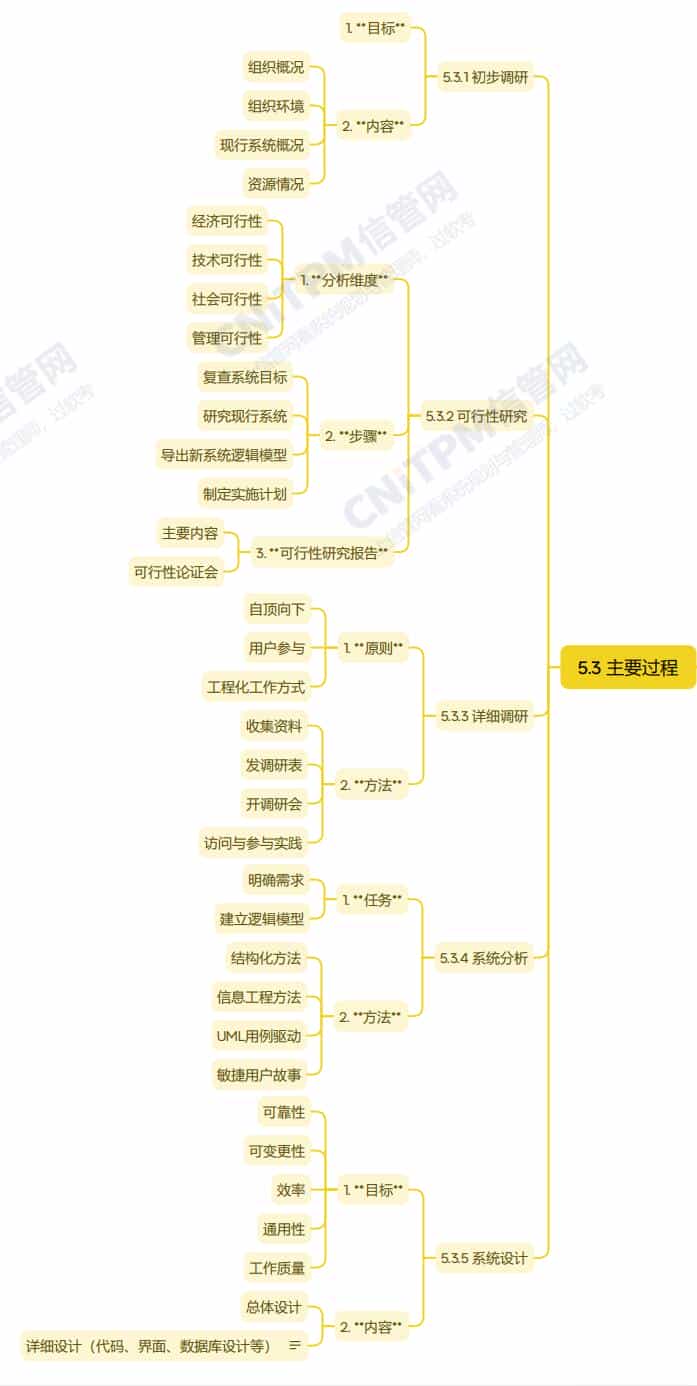 系统规划与管理师第2版教程第五章应用系统规划第三节主要内容考点涉及:初步调研目标和内容、可行性研究步骤、可行性研究报告、详细调研原则和方法、系统分析任务和方法、系统设计目标与内容等,具体思维导图整理如下: