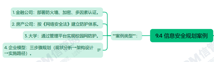 系统规划与管理师第3版教程第九章信息安全规划第四节主要内容考点涉及:信息安全规划案例类型等,具体思维导图整理如下: