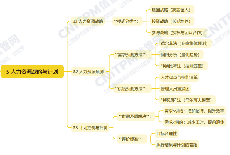 系统规划与管理师第3版教程第十三章人员管理第三节主要内容考点涉及:人力资源战略分类模式、人力资源需求预测方法、人力资源供给预测方法、计划与控制评价等,具体思维导图整理如下: