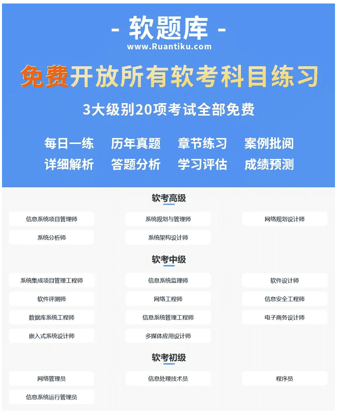 涵盖所有软考开考资格科目,并提供答案解析。让你不再四处盲目找题,一站全搞定!!