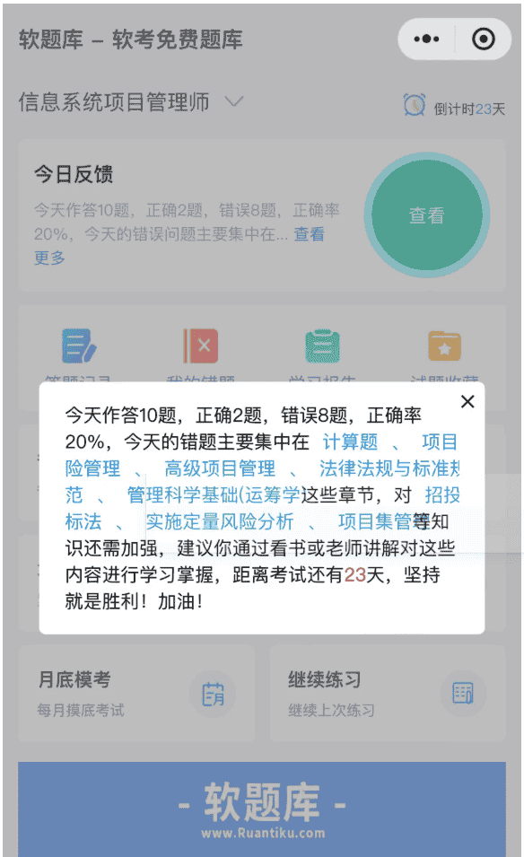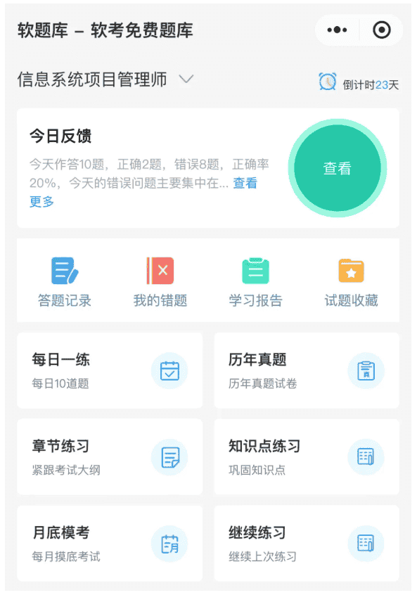 软题库功能全面,目前提供每日一练、真题模考、章节练习、知识点练习、月底模考、答题反馈、案例AI批阅、AI答题分析、答题记录、错题记录、试题收藏、学习评估、成绩预测等功能,试题包含参考答案和解析,所有功能都免费使用,满足考生备考需求。