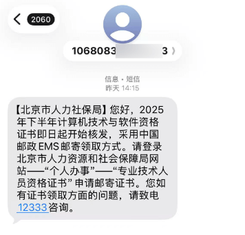 根据北京人社局发送的相关短信得知,北京2025年下半年软考证书于2026年1月7日开始发放,考生可通过快递邮寄的方式申领证书,具体详见短信内容。