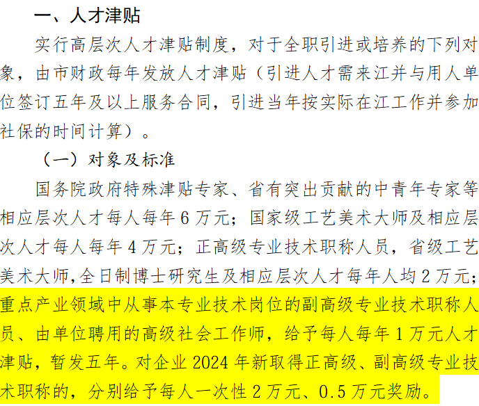 重点产业领域中从事本专业技术岗位的副高级专业技术职称人员给予每人每年1万元人才津贴,暂发五年。对企业2024年新取得副高级专业技术职称的,给予每人一次性0.5万元奖励。