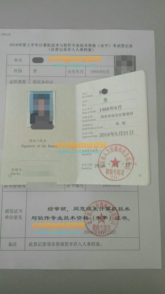 2016年最新北京信息系统项目管理师证书样本和登记表样本