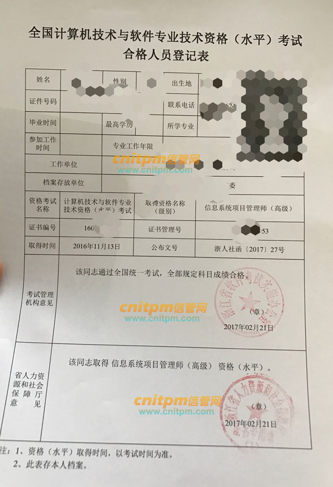 浙江2017年软考信息系统项目管理师合格人员登记表样本,资格考试登记表,职称考试登记表。