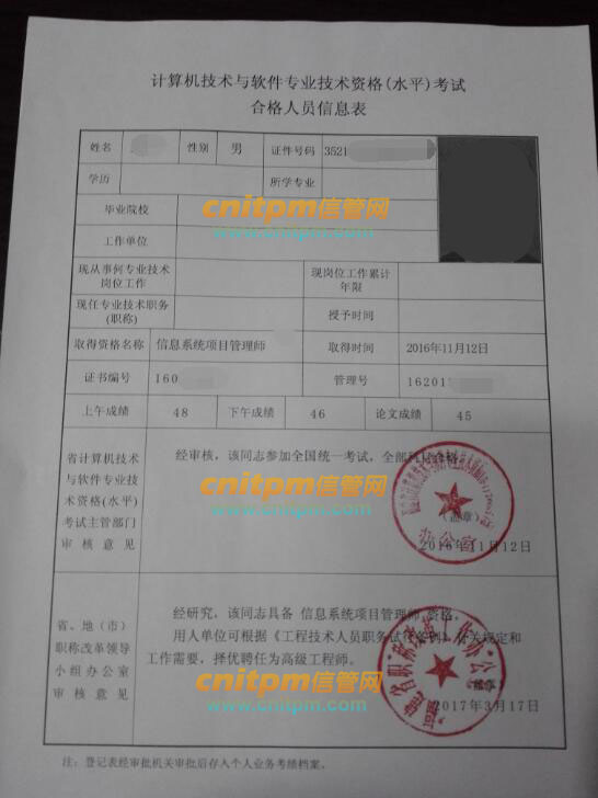 福建软考信息系统项目管理师合格人员信息表,福建考生通过软考信息系统项目管理师后,在领取证书的时候还会领取到一张合格人员信息表,信息表上注明了你考试资格名称、资格考试等级、资格考试各科成绩,同时会盖计算机技术与软件考试主管部门红章以及当地职称改革领导小组办公室红章,以下为JRS直播学员的合格信息表。