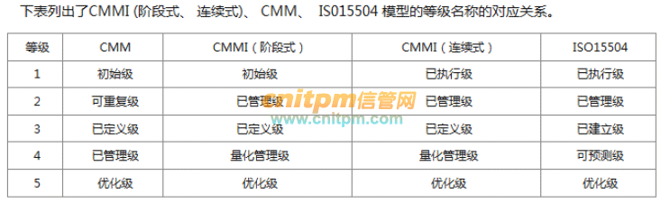 2、CMMI提供两种模型表述方式:连续式和阶段式。前者描述过程能力成熟度,后者描述