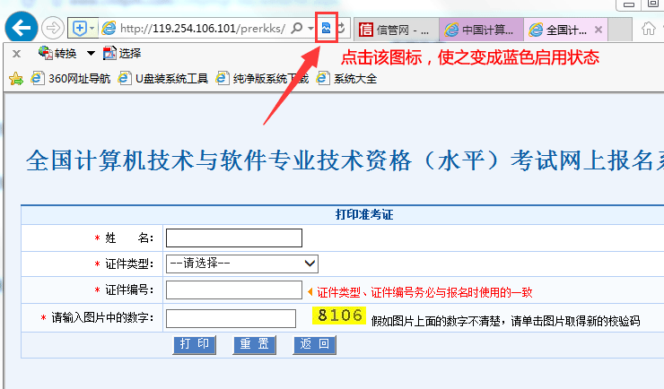 1、打开系统自带的IE浏览器,点击以下地址进入准考证打印页面(只针对准考证是在软考办官方网站打印的省市,如果不是请查看准考证打印专题)