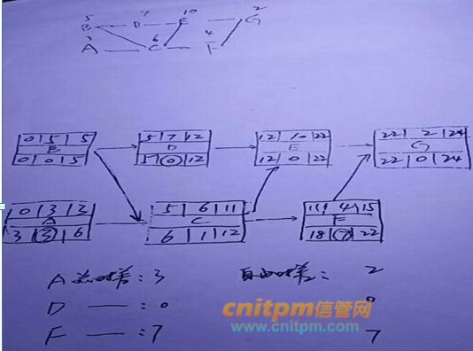 A的自由时差2周,总时差3周;D的自由时差和总时差都是0周;F的总时差是7周,自由时差也是7周