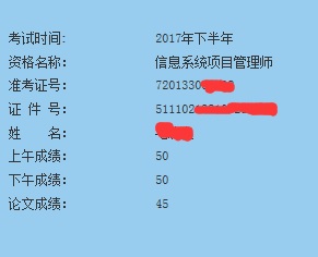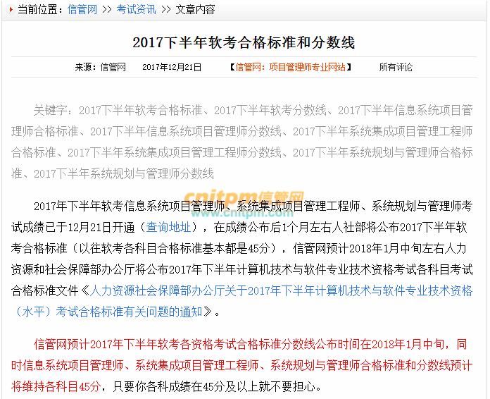 2017年下半年软考各资格考试合格标准分数线公布时间在2018年1月中旬,同时信息系统项目管理师、系统集成项目管理工程师、系统规划与管理师合格标准和分数线预计将维持各科目45分,只要你各科成绩在45分及以上就不要担心。