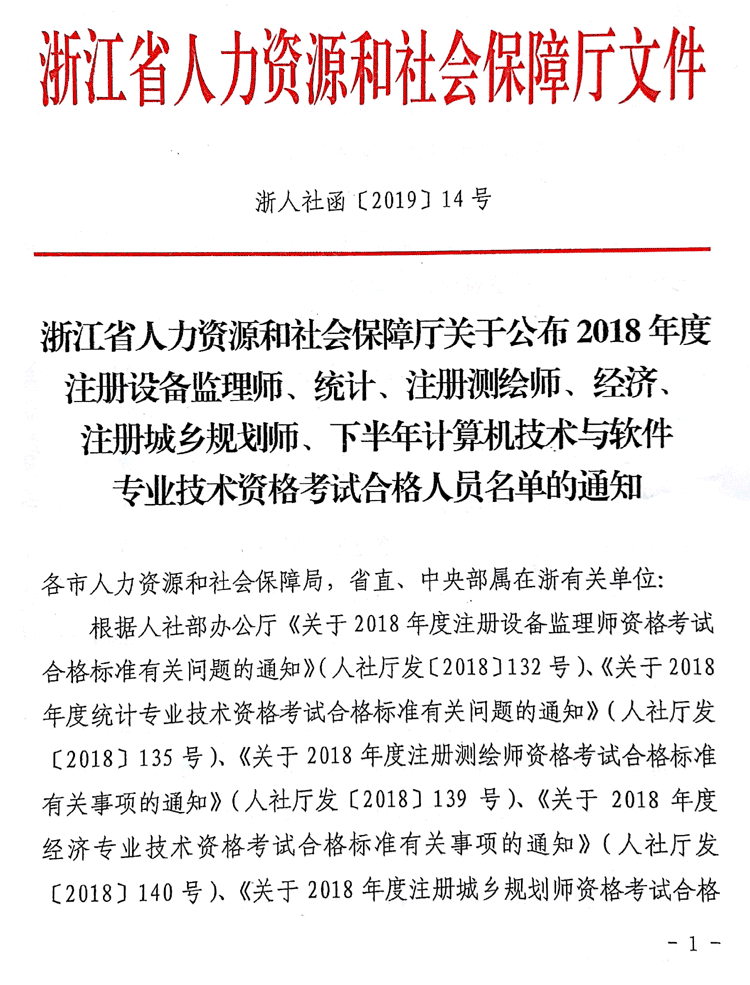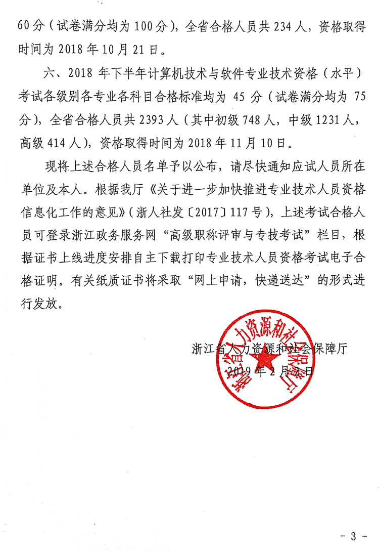 浙人社函〔2019〕14号:浙江省人力资源和社会保障厅关于公布2018年下半年计算机技术与软件专业技术资格考试