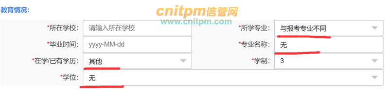 在2019年下半年软考信息系统项目管理师、系统集成项目管理工程师等考试报名过程中,有的考生是高中或初中及以下学历,那么在填写报名信息的时候,教育情况相关信息如何填写,JRS直播这里给出相关参考,把握的一个原则就是尽量按真实情况填写: