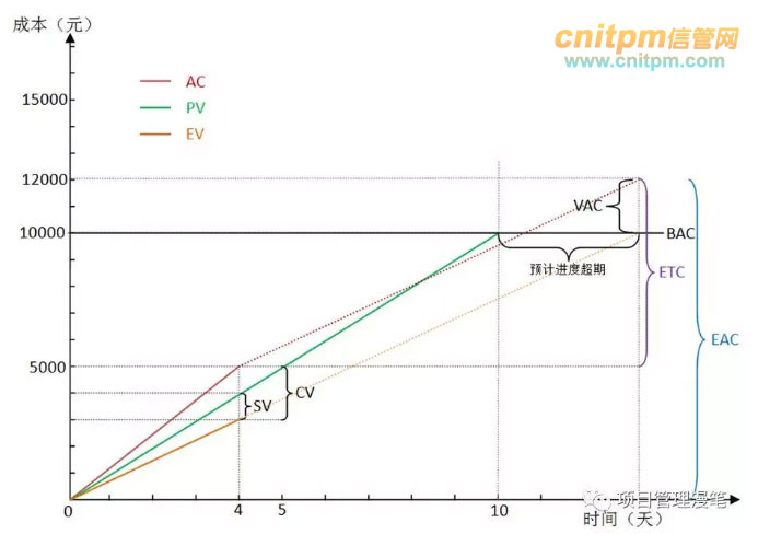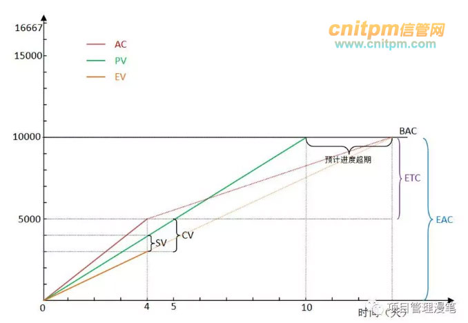 从图中可以看到,AC线是在4天内实线的基础上延伸的虚线(实线表示实际值,虚线表示预测值),直接延伸表示花钱的速度不变(因为斜率没变)跟以前保持一致。这种情况下可以看到当EV达到BAC的时候(表示做了10000元的事项目做完了),AC的值是16667元,这个就是预测的最终项目完工的时候将会一共花这么多钱,也就是EAC,其与BAC的差额就是完工偏差VAC。