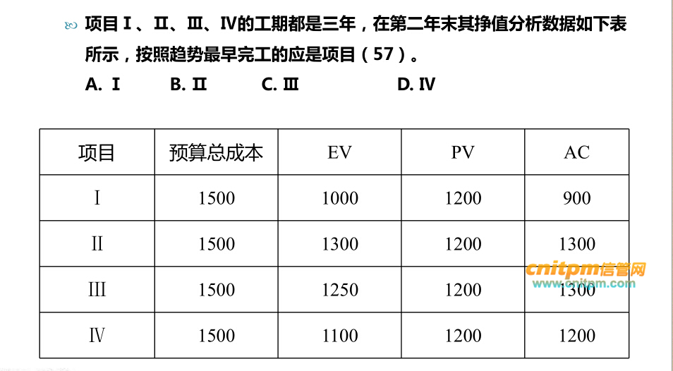 项目I、II、III、IV的工期都是三年,在第二年末其挣值分析数据如下表所示。 按此趋势最早完工的应是项目(_试题库-JRS直播