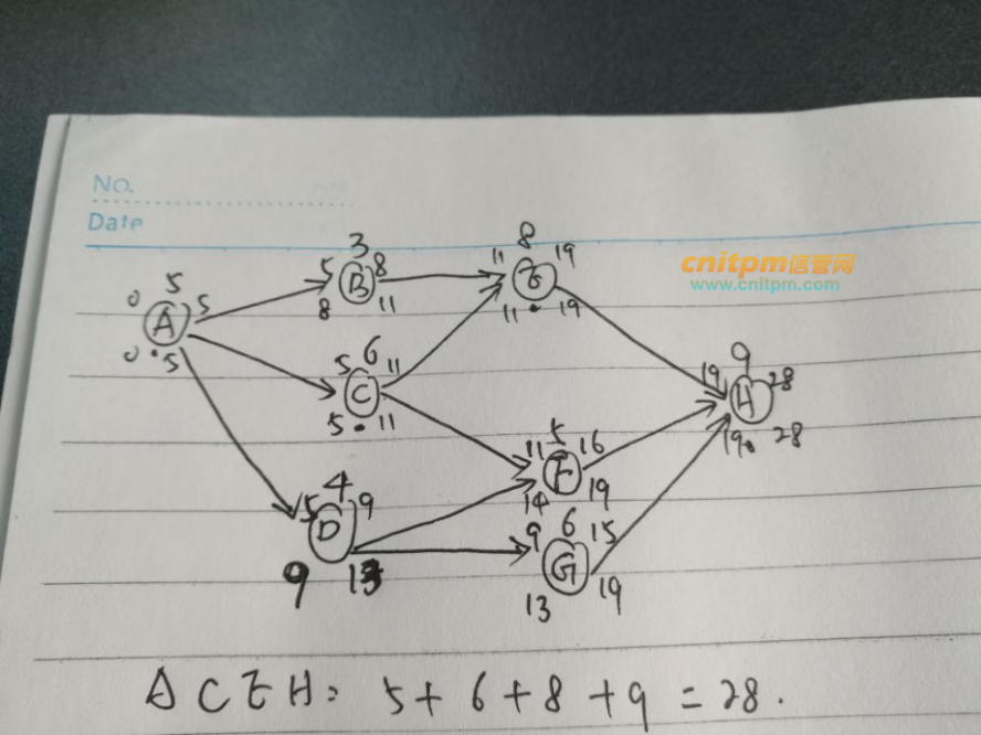 d活动后面没有关键路径,自由时差为0。关键路径aceh,共28条,d活动最长路径24天,d活动本身4天,所以最迟开始时间,第10天。同理,g活动第14天