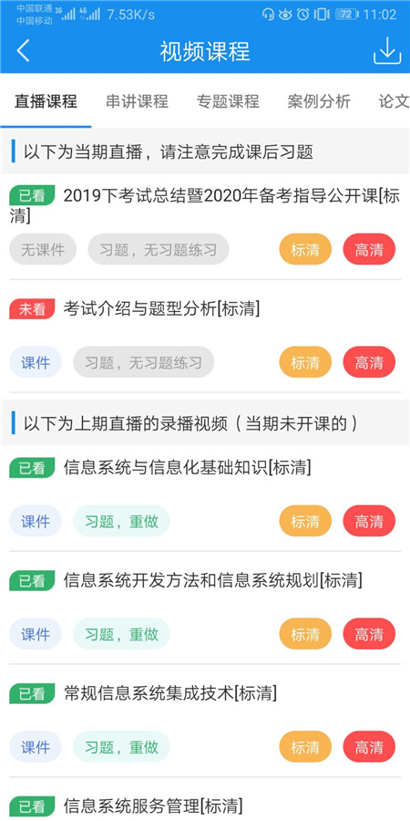 在我的页面点击视频课程,可以观看直播课程、串讲课程、专题课程、案例分析等
