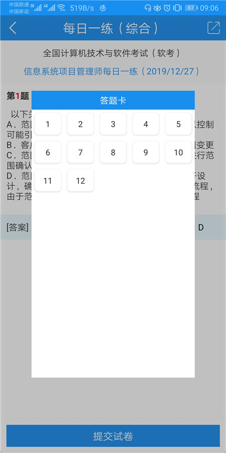 答题模式是需要做完全部12道题目,才能查看解析,可选查看全部解析或者查看错题解析,查看解析时可以收藏试题。