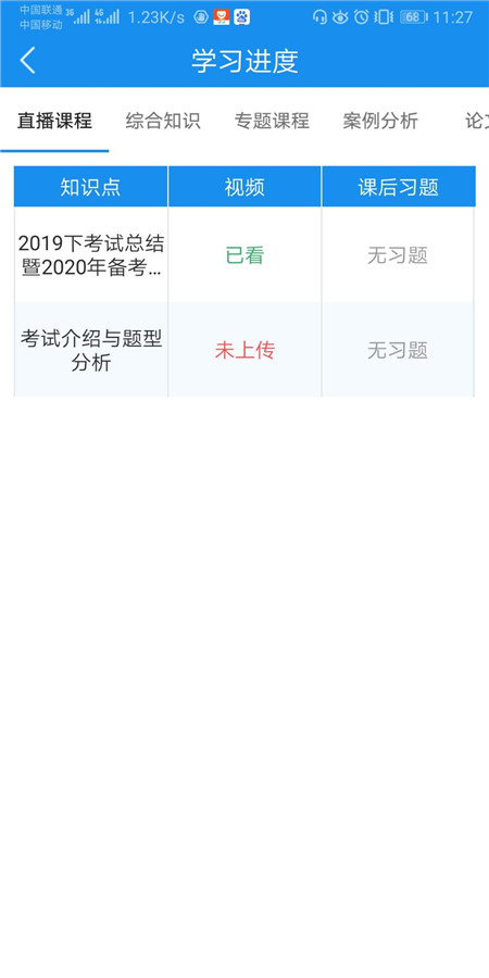 在这里可以看到直播课程、综合知识的视频是否有观看