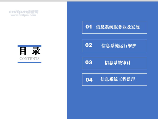 课程内容:信息系统服务业及发展、信息系统运行维护、信息系统审计、信息系统工程监理