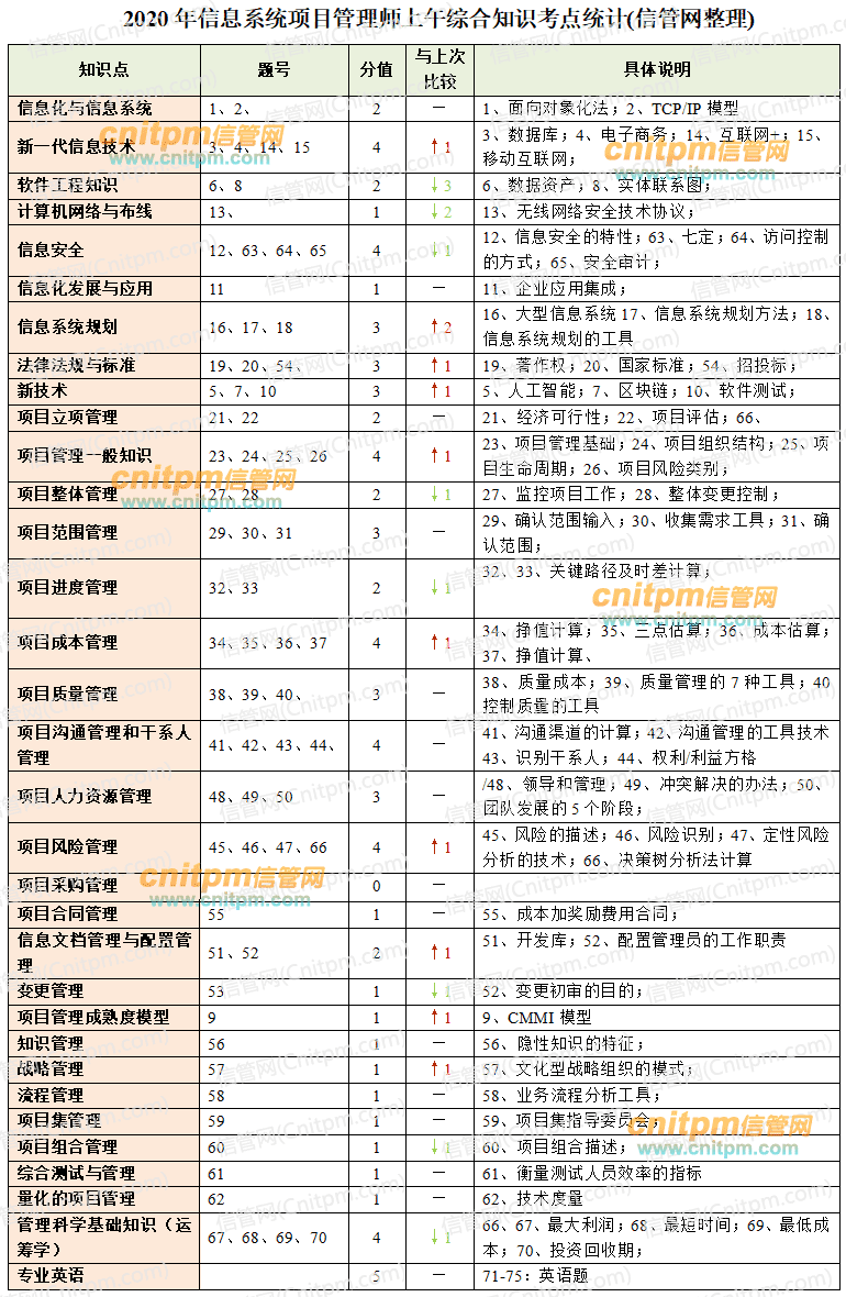 信息系统项目管理师考试知识点分布广,范围宽,涉及到信息化知识、信息技术知识、项目管理知识、计算机网络基础知识、信息安全知识、法律法规知识、组织级项目管理知识、项目集管理、项目组合管理、管理科学基础知识、专业英语知识等内容。就2020年高级信息系统项目管理师考试来说,上午综合知识非常简单;案例分析这次因为计算题挣值的计算有理解上的歧义,是大家普遍感觉比较不放心的一个科目;论文中规中矩,二个论题都是十大管理领域的。总体来说,2020年信息系统项目管理师考试是近年来最简单的一次考试了。