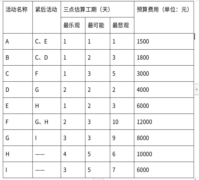某公司承接了一个为政府客户软件开发项目,王工担任项目经理,按照公司的要求,制定了项目工期预算表(见下表)。