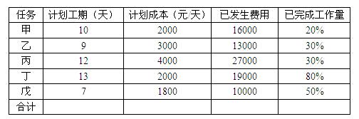 某项目经理将其负责的系统集成项目进行了工作分解,并对每个工作单元进行了成本估算,得到其计划成本。各任务同时开工,开工5 天后项目经理对进度情况进行了考核,如下表所示: