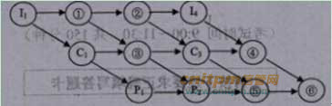 某计算机系统中有一个CPU、一台输入设备和一台输出设备,假设系统中有四个作业T1、T2、T3和T4,系统采用优先级调度,且T1的优先级>T2的优先级>T3的优先级>T4的优先级。每个作业具有三个程序段:输入Ii、计算Ci和输出Pi(i=1,2,3,4),其执行顺序为Ii→Ci→Pi。这四个作业各程序段并发执行的前驱图如下所示。图中①、②、③分别为(1),④、⑤、⑥分别为(2)。