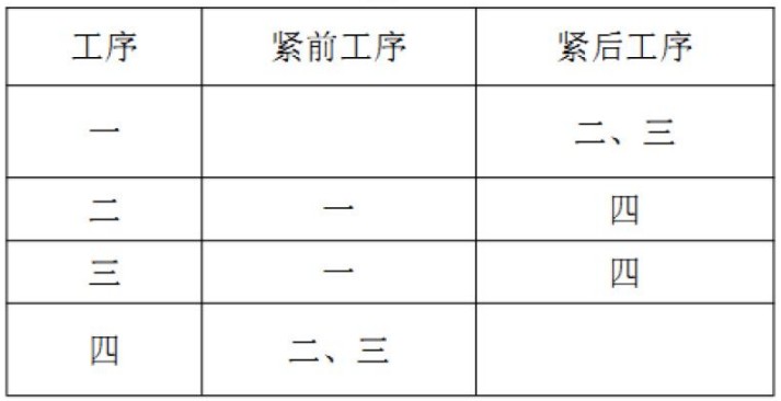 一个活动有4道工序,一个工人只能负责1道工序。每名工人完成各工序所需小时数如表1所示,工序间的依赖关系如表2所示。完成该活动最少需要( )小时。表一:表二:A、10B、14C、16D、18