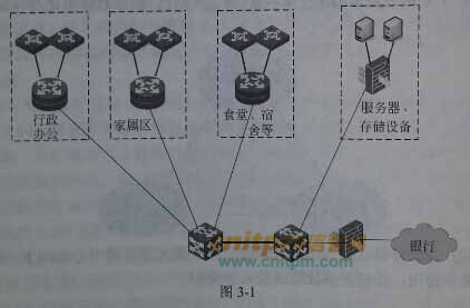 某部队院校早期的一卡迪建设方案主要为保障校内师生的图书、食宿、医疗等服务,系统包括了一卡通专网建设、一卡通平台建设. 一卡迪数据中心以及校园门禁与校园网视频监控等内容.行政办公、家属区、食堂、学生宿舍、开水房等营业网点通过汇聚交换机接入到核心交换机,服务器及存储设备直接连接核心交换机,网络拓扑结构如阁3-1 所示.