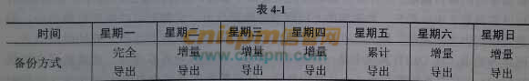该金融系统上线初期,整个业务系统采用了内网方式运行,不与外网发生联系。为了保证数据库内部数据的安全,该银行信息中心的刘工提出的备份方案如表4-1所示。