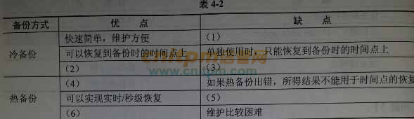 请分别说明冷备份和热备份的概念,并补充表4-2中的空(1)~(6)。