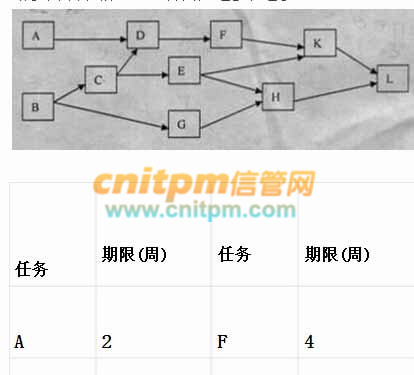 请参阅以下信息,回答问题25和26:25.任务D提前四周完成。这对项目期限产生什么影响?A.项目期限没有任何改变B.期限减少一周C.期限减少三周D.期限减少四周26.描述该变更之前原关键路线的任务顺序为何?A.B、G、H和LB.A、D、F、K和LC.B、C、E、K和LD.B、C、D、F、K和L