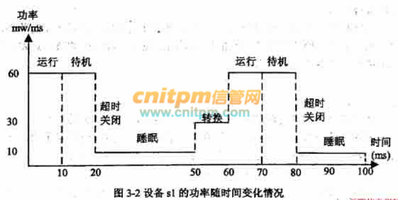 手持式野外辅助装备由三个实时任务和三个独立设备组成(分别表示为:t1、t2和t3;s1、s2和S3),表3-1给出了手持式设备实时任务的时间参数表,这些任务使用独立的设备并且所有设备的特征一致,各设备待机超时可直接进入睡眠状态,处于睡眠状态的设备要经过转换状态后才能进入运行状态。假设初始状态(t=0)设备处于工作状态,且所有设备的工作状态功率为60mw/ms,转换功率为30mw/ms,睡眠功率为10mv/ms。同时假设设备被唤醒的转换时间为10ms。设备待机后被关闭的超时值为10ms。