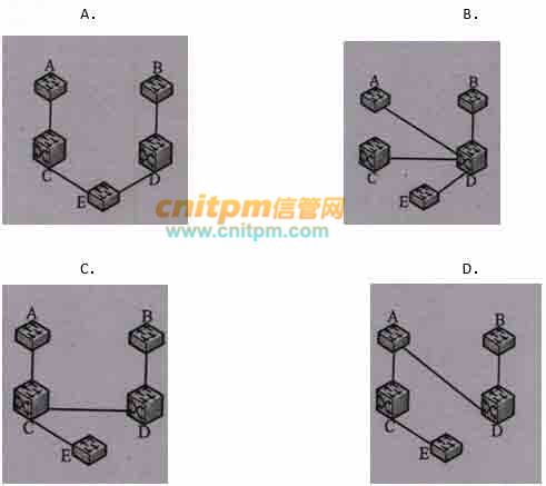 下图所示是一个园区网的一部分,交换机A和B是两台接入层设备,交换机c和D组成核心层,交换机E将服务器群连接至核心层。如图所示,如果采用默认的STP设置和默认的选举过程,其生成树的最终结果为()。