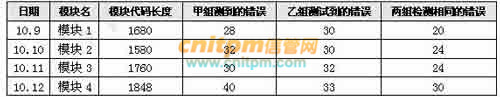 某企业需要对自己开发的、代码规模为18480行的程序astroinfo进行测试,企业主管指定李工安排该测试工作。李工决定由甲、乙两个测试小组每天独立测试同一个程序模块,每个测试小组由程序设计入员和有关用户代表两类人员构成。甲、乙两个测试小组记录的相关测试情况如下:
