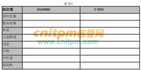 本企业原先实施着IS09000系列,大家已习惯了IS09000系列的管理方式,如果要实施CMM,在企业管理上应该做哪几点改进?请在答题纸上填充表3-1的空白以说明IS09000系列对软件开发的要求与CMM要求的主要差异。