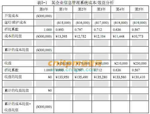 某企业准备开发一个信息管理系统,其生存周期为5年。该系统的预计开发成本、预计的年运行/维护成本,以及预计的收益如表5—1所示(其中带括号的数据表示负值)。