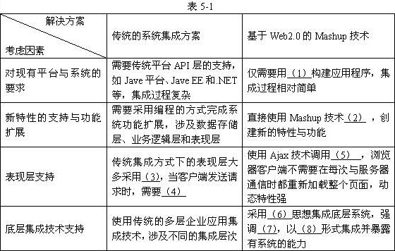 某房地产信息网站欲整合Google提供的地图信息(Google Maps)和Craigslist(美国最大的分类广告网站)提供的房地产信息,为用户提供新的房地产信息增值服务。负责网站建设的工程师提出了两种解决方案,第一种方案拟采用传统的应用系统集成方法,集成来自不同源的数据。另外一种采用基于Web 2.0的Mashup技术,从不同的数据源抽取数据,聚合并转换数据,在不同的上下文使用,具体如表5-1所示。请阅读并完成表中空白部分(标号(1)~(8)处)。