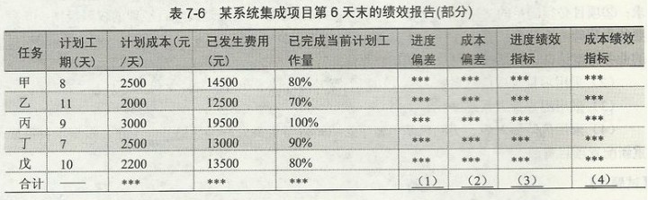 请计算该项目在第6天末的进度偏差、成本偏差、进度绩效指标、成本续效指标,分别填入表7-6中的(1)~(4)空缺处.并从进度和成本两方面评价项目的当前执行绩效情况。