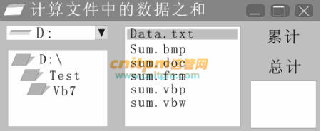 用户只要通过驱动器列表框、目录列表框和文件列表框,选择文本文件所在的驱动器、文件夹及相应的文件名,再单击“累计”按钮,就能在“总计”文本框中看到该文本文件中的数据之和。