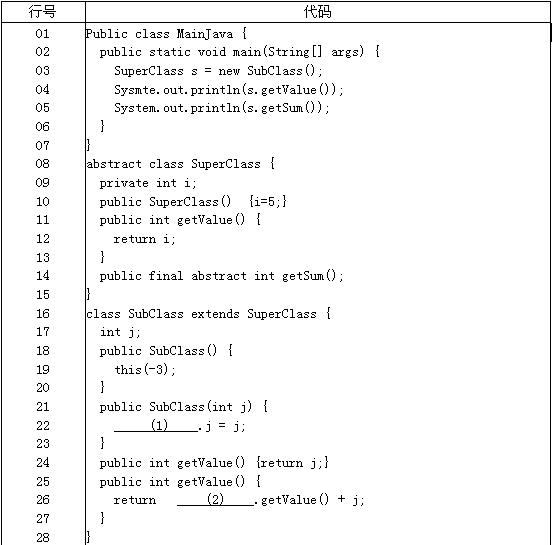 阅读以下说明和Java代码,将解答写在答题纸的对应栏内。【说明】已知类SubClass的getSum方法返回其父类成员i与类SubClass成员j的和,类SuperClass中的getSum为抽象函数,程序中的第14行有错误,请修改该错误并给出修改后的完整结果,然后完善程序中的空缺,当程序运行到第22行且尚未执行第22行语句时成员变量i的值,最后给出程序运行后的输出结果。【Java 代码】