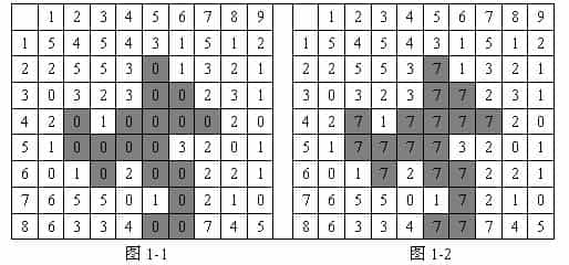 例如,一幅8*9像素的图像如图1-1所示。设用户指定点(3,5),其颜色值为0,此时其上方(2,5)、下方(4,5)、右方(3,6)邻接点的颜色值都为0,因此这些点属于点(3,5)所在的同色邻接区域,再从上、下、左、右四个方向进行扩展,可得出该同色邻接区域的其他点(见图1-1中的阴影部分)。将上述同色区域的颜色替换为颜色值7所得的新图像如图1-2所示。