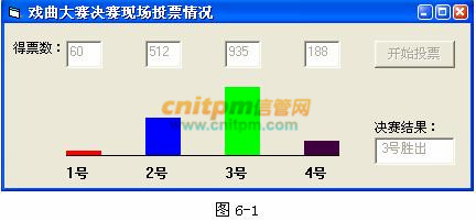 某电视台拟开发应用程序来显示戏曲大赛中1~4号四位选手决赛的现场投票情况。该程序从现场观众中(不超过2000人)每0.5秒收集一次对这四位选手的支持票数,并在屏幕上动态显示这四位选手的票柱(以高度反映票数)与累计得票数,如图6-1所示。投票过程限时30秒,每名观众最多为1名选手投票。投票结束后系统通过比较各位选手的累计得票数,显示决赛结果:“*号胜出”(如有单个冠军)或“继续进行PK”(如有多人获得相同的最高票数)。