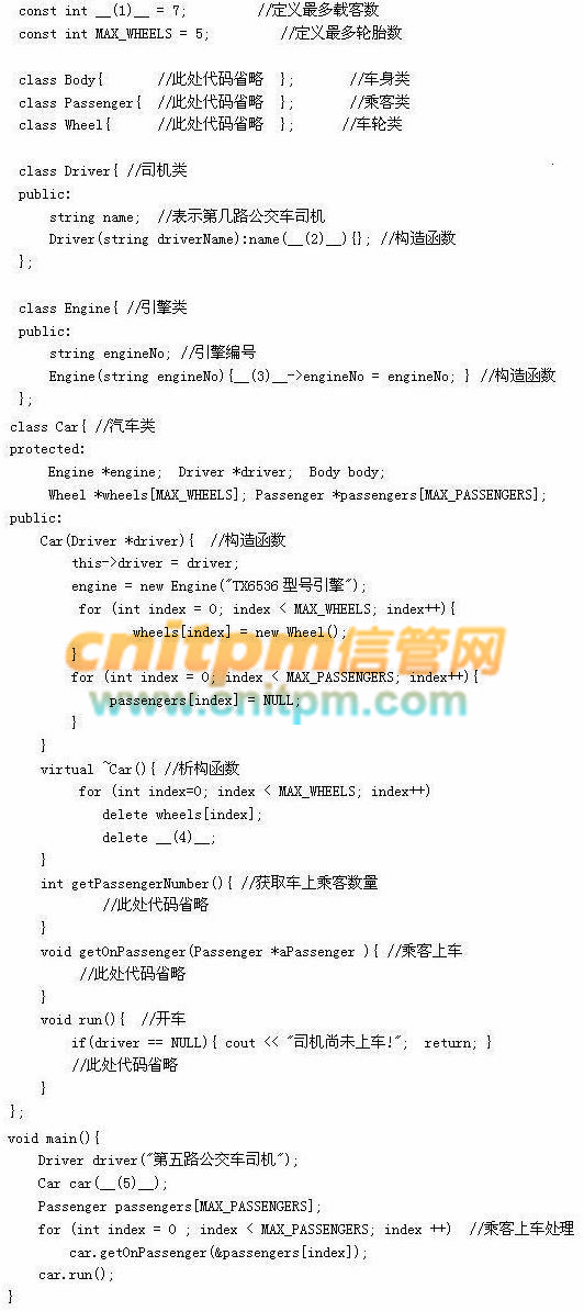 阅读下列说明、图和C++代码,将应填入 (n) 处的字句写在答题纸的对应栏内。【说明】 已知对某载客车辆(Car)进行类建模,如图5-1所示,其中类Engine表示发动机引擎,类Wheel表示车轮,类Body表示车身,类Driver表示司机,类Passenger表示乘客。