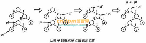 函数LeafCode从叶子到根逆向求叶子结点的编码。例如,对图3-1中叶子结点a求编码的过程如图3-3所示。