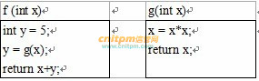 函数f()、g()的定义如下所示,已知调用f时传递给其形参x的值是3,若以传值方式调用g,则函数f的返回值为(1);若以传引用方式调用g,则函数f的返回值为(2)。