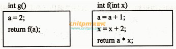 函数g和f的定义如下所示,其中,a是全局变量。若在函数g中以引用调用( callby reference)方式调用函数f(a),则函数g的返回值为(1),此时变量a的值为(2)。