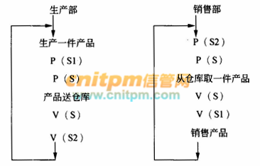 某企业有生产部和销售部,生产部负责生产产品并送入仓库,销售部从仓库取产品销售。假设仓库可存放n件产品。用PV操作实现他们之间的同步过程如下图所示。