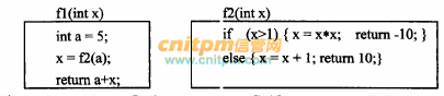 己知函数 f1()、f2()的定义如下图所示 设调用函数 f1时传递给形参 x 的值是1,若 函数调用f2(a)时采用引用调用 (call by reference )的方式传递信息,则函数f1的返回值为(1);若函数调用f2(a)以值调用 (call by value) 的方式传递信息,则函数f1的返回值为(2)。