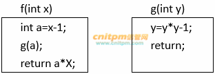 已知函数f()、g()的定义如下所示,执行表达式“x=f(5)”的运算时,若函数调用g(a)是引用调用(call by reference)方式,则执行“x=f(5)”后x的值为(1);若函数调用g(a)是值调用(call by value)方式,则执行“x=f(5)”后x的值为(2)。